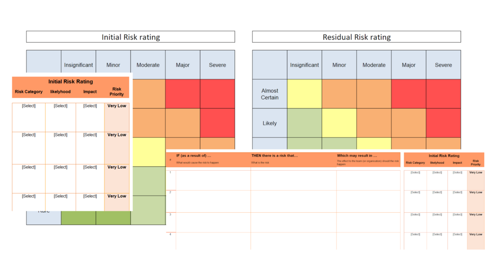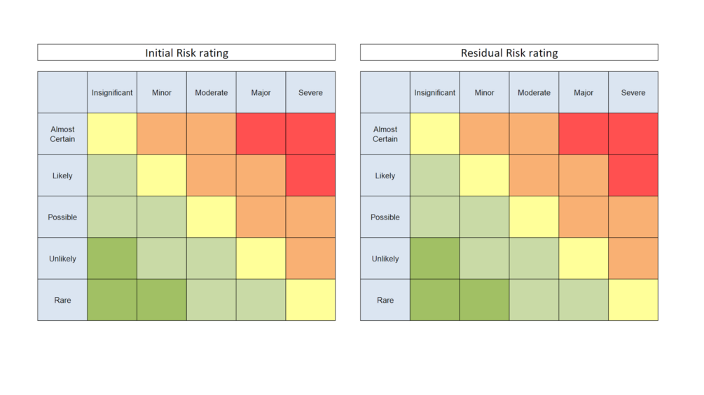Risks are plotted against a standard 5x5 Risk matrix, both for the initial assessment and the residual risk assessment.