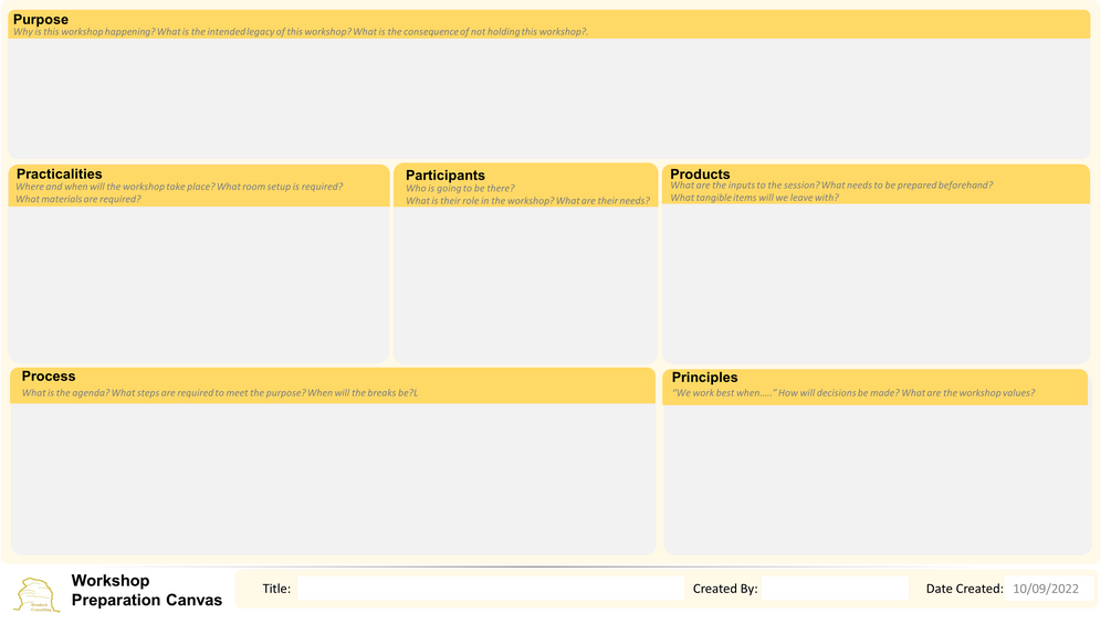 Often details of workshop planning might be scattered across several communications or documents. This canvas brings it all together in a workshop template.